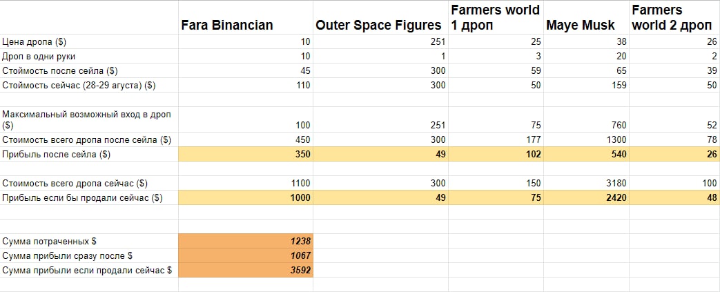 1) Дроп Fara Binancian от Binance NFT. Была возможность купить 10 коробок по 10$. Прибыль сразу после сейла - 350$. Прибыль, если бы продали сейчас - 1000$. Купить было очень сложно.