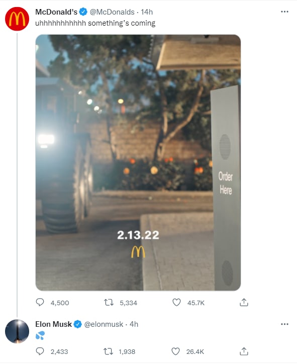 Сегодня вечером Макдональдс обещает какой-то анонс, всё было бы стандартно, если бы не комментарий Илона Маска под записью