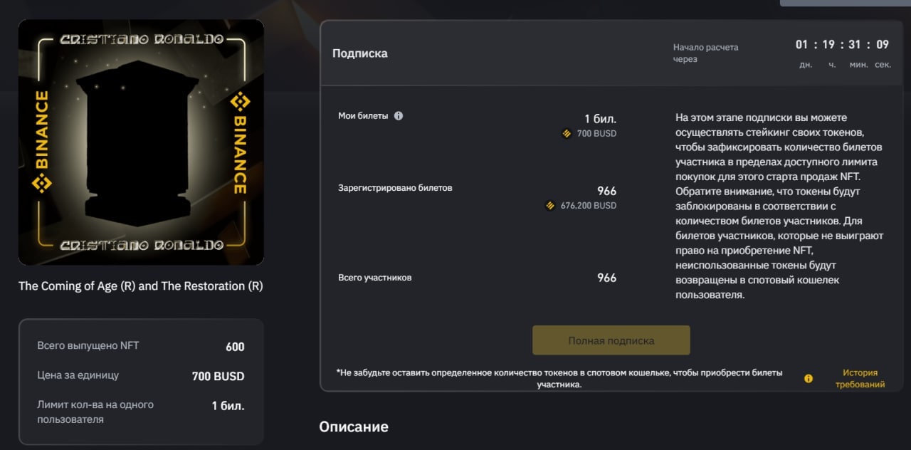 На Binance сейчас идет подписка на возможность купить лимитированную NFT