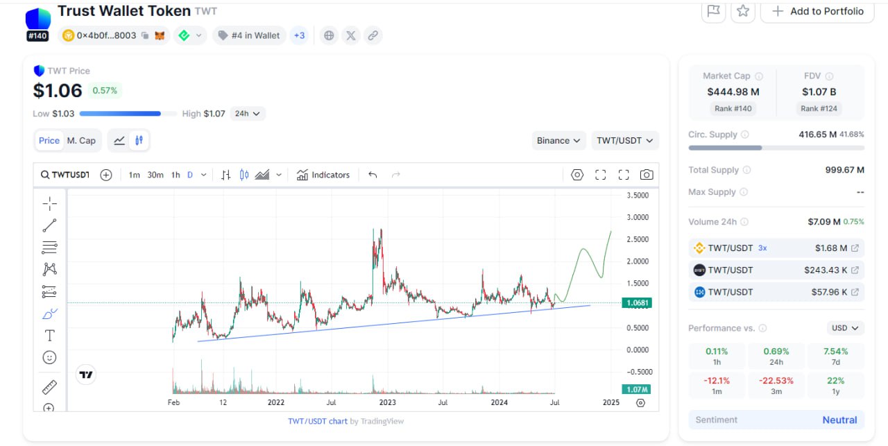 Пожалуй, моя самая любимая монета - TWT, проект одного из лучших кошельков Trust Wallet, да такая, что про нее как раз выражение «от любви до ненависти…»