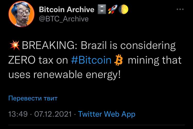 🗓Бразилия рассматривает нулевое налогообложение для биткоин-майнинга на возобновляемых источниках энергии