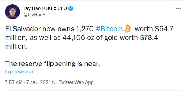 🗓Стоимость биткоинов в резервах Сальвадора скоро обгонит стоимость их золотого запаса!