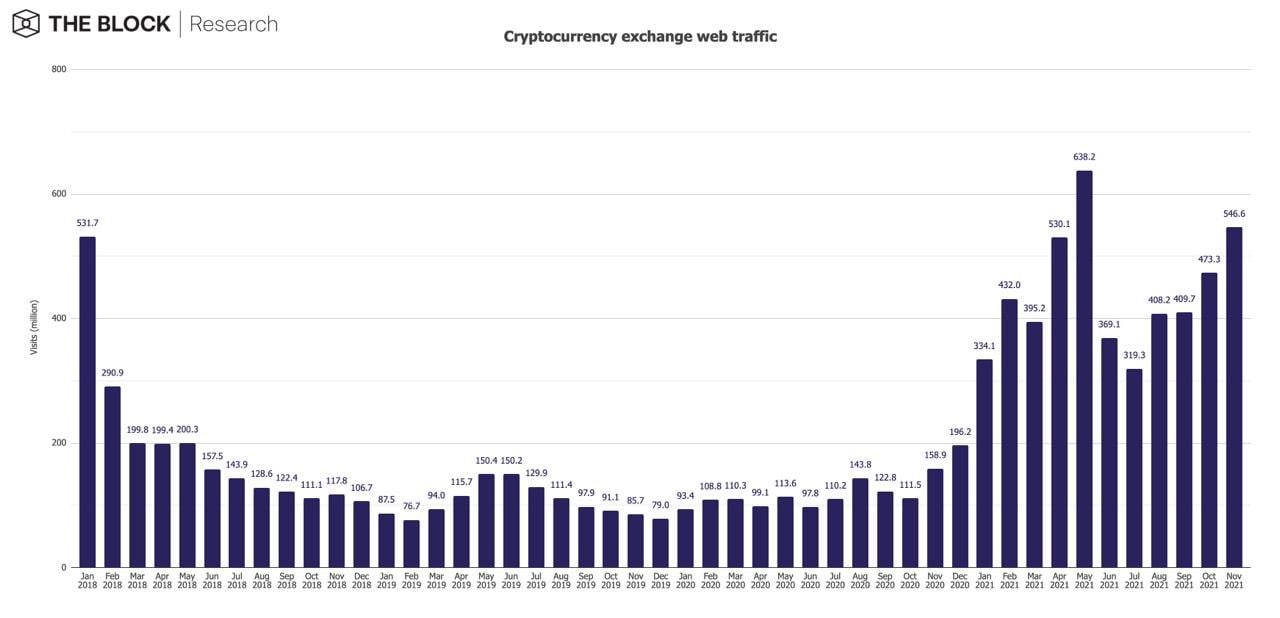 📈Веб-трафик криптовалютных бирж вырос до 546,6 млн посещений в ноябре (+15,5% за месяц)