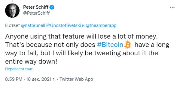 "Любой, кто воспользуется этой функцией, потеряет много денег. Это не только потому что биткоину предстоит долгий путь к падению, но и я, вероятно, буду писать об этом в Твиттере всю дорогу!"