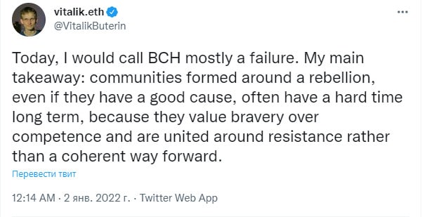 🗓Виталик Бутерин назвал проект Bitcoin Cash (BCH) "неудачей"