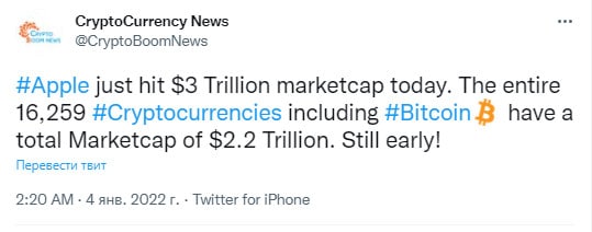 🗓"Сегодня рыночная стоимость Apple достигла $3 трлн. Все 16 259 криптовалют, включая биткоин, имеют общую рыночную стоимость $2,2 триллиона. Мы все еще на очень ранней стадии принятия!"