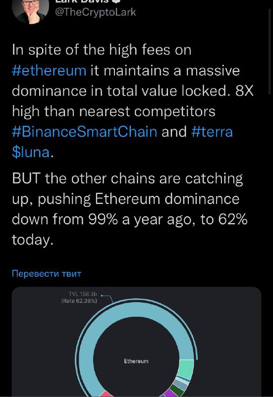 «Несмотря на высокие комиссии на Ethereum, он сохраняет мощное доминирование в общей стоимости заблокированных средств. В 8 раз выше, чем у ближайших конкурентов Binance Smart Chain и Terra.