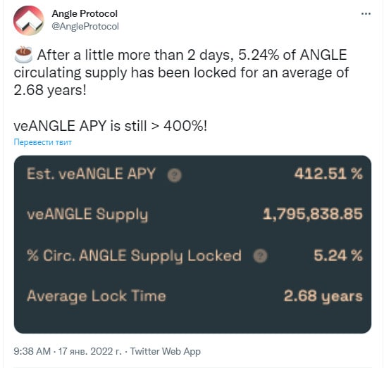 🗓5.24% всей эмиссии ANGLE находятся в стейкинге со средним временен блокировки 2,68 года, а годовая процентная доходность все еще превышает 400%!