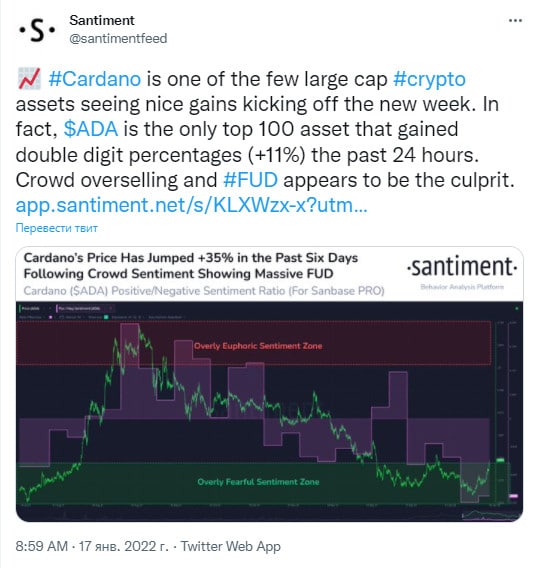 🗓Cardano - единственная криптовалюта с многомиллиардной капитализацией из ТОП-10, показавшая за последние сутки двузначный рост в процентах (+11%). Причиной Santiment называют перепроданность