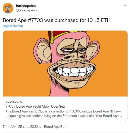 🗓Bored Ape номер 7703 был сегодня куплен за 101.5 эфиров ($241 000). Предыдущий владелец купил его за 44 эфира и холдил токен 5 месяцев