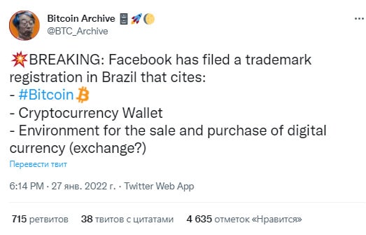 🗓 BREAKING: Facebook подал заявку на регистрацию товарного знака в Бразилии, в которой упоминаются: