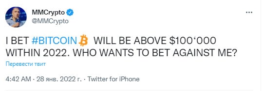 Его ставка - биткоин будет выше $100000 в 2022 году