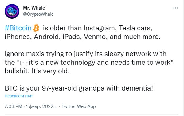 🗓Mr Whale назвал биткоин "97-летним дедом с деменцией"
