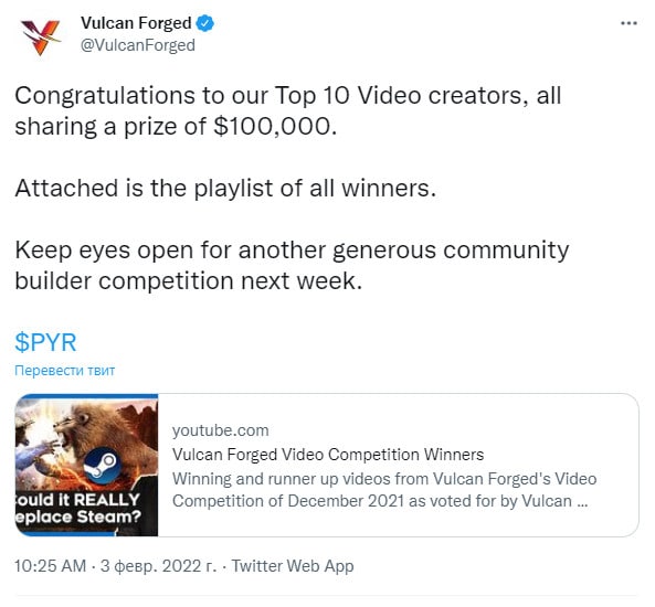 🗓Платформа Vulkan Forged задонатила $100 000 в токенах PYR десяти лучшим авторам видео