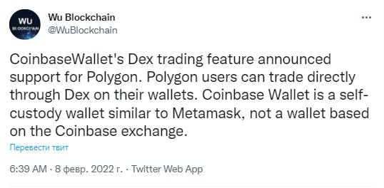 🗓DEX от CoinbaseWallet объявила о поддержке Polygon. Пользователи Polygon могут торговать непосредственно через DEX на своих кошельках. Coinbase Wallet - это самостоятельный кошелек, подобный Metamask, а не кошелек, основанный на бирже Coinbase