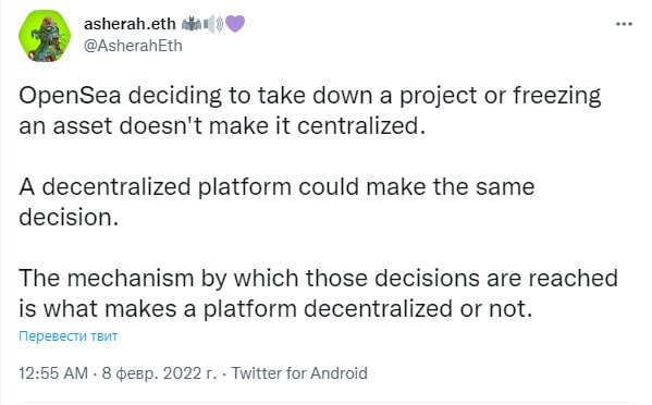 "Решение OpenSea закрыть проект или заморозить актив не делает его централизованным.
