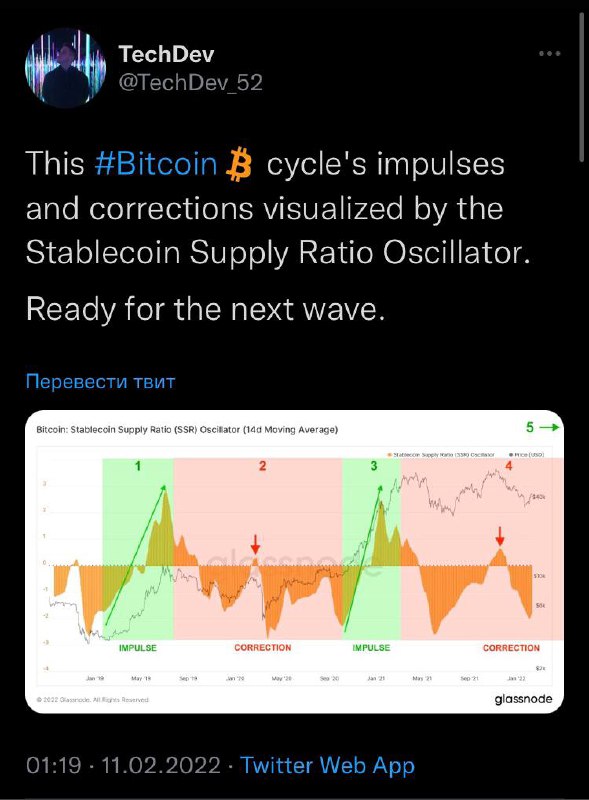 «Импульсы и коррекции этого цикла биткоина визуализированые Осциллятором коэффициента предложения стейблкоина.