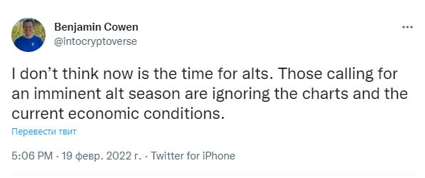 "Не думаю, что сейчас время для альтов. Те, кто кричит, о неизбежном сезоне альткоинов, игнорируют графики и текущие экономические условия"
