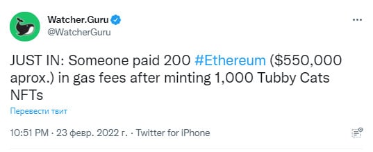 🗓"Кто-то заплатил 200 эфиров (примерно 550 000 долларов) в качестве платы за газ после минтинга 1000 NFT Tubby Cats"