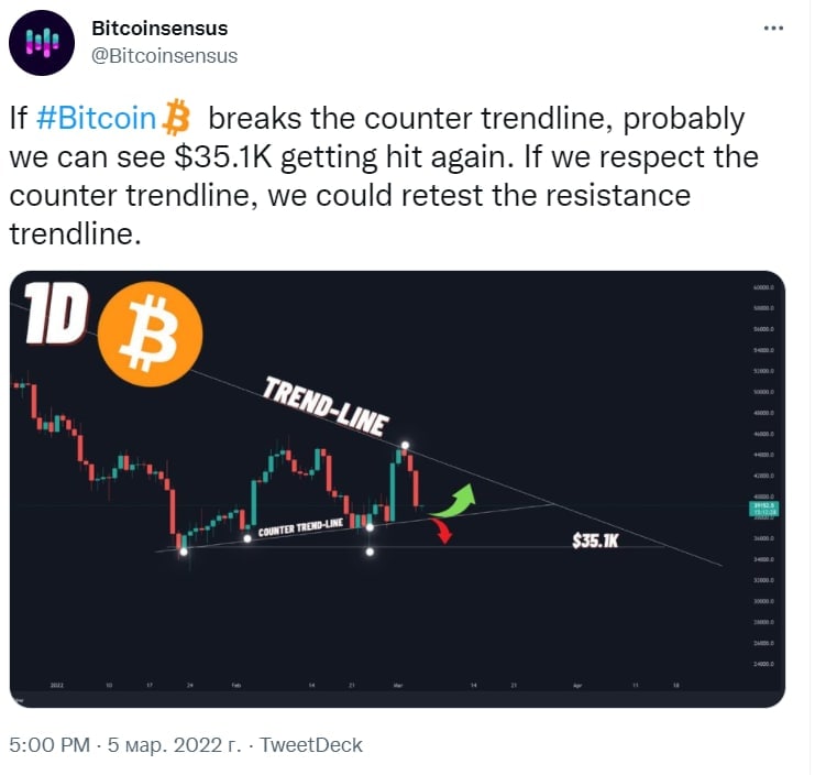 🗓 "Если Биткоин пробьет нисходящую линию тренда, вероятно, мы снова увидим цену 35,100$. Если не пробьёт, то сможет повторно протестировать уровень сопротивления"