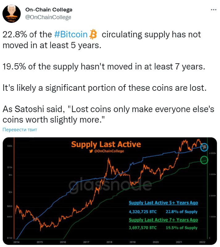 🗓 "22,8% оборотного предложения биткоина не двигалось как минимум 5 лет.