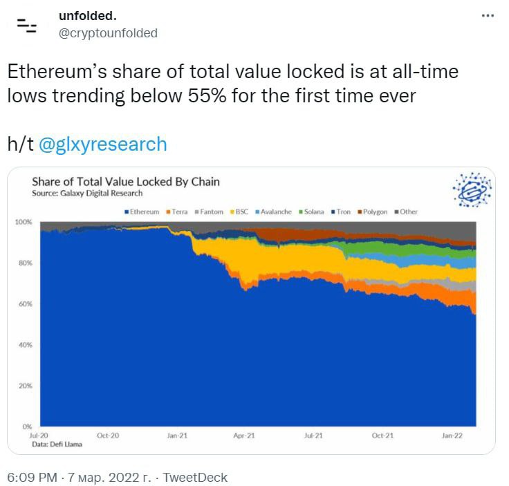 🗓 "Доля Ethereum в TVL по всем сетям находится на рекордно низком уровне, впервые в истории опустившись ниже 55%"