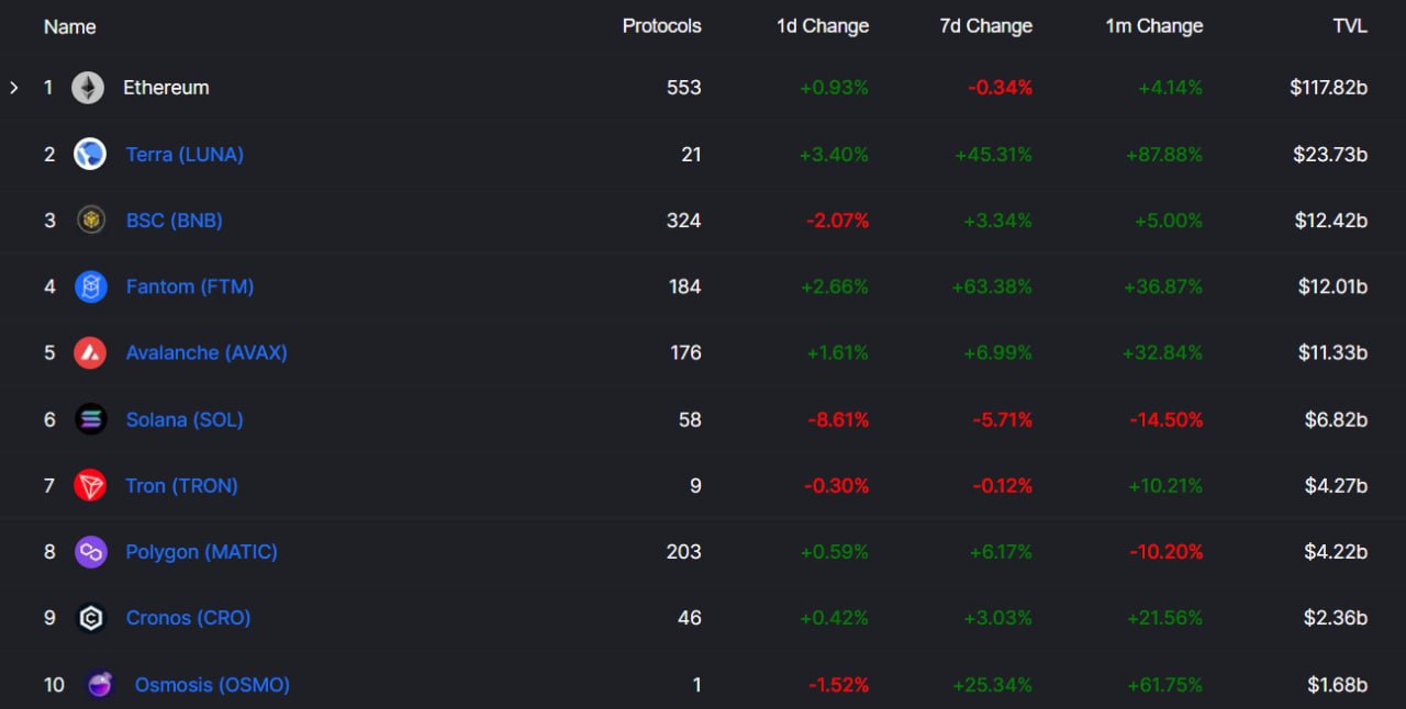 📈 Вот так выглядит топ 10 сетей по TVL на данный момент