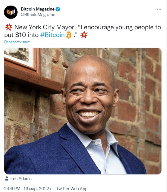 🗓Мэр Нью-Йорка Эрик Адамс: «Я призываю молодых людей вложить $10 в биткоин»