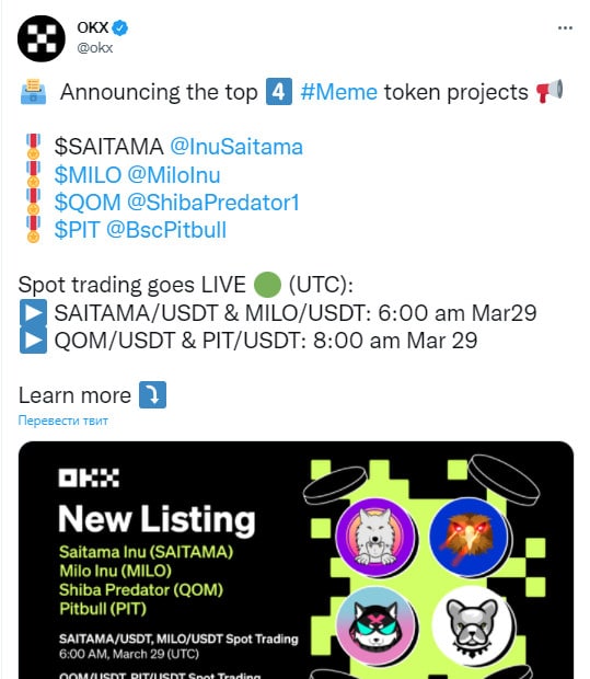 🗓Биржа ОКХ (бывшая ОКЕХ) залистит сегодня 4 мем-токена: