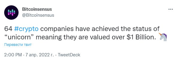 🗓64 криптовалютные компании получили статус «единорога». Это означает, что их стоимость превышает 1 миллиард долларов.