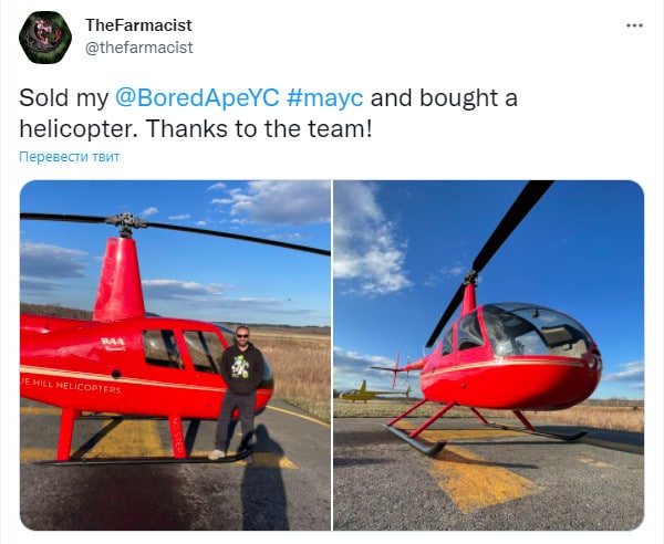 🗓Парень продал свой NFT из коллекции Bored Ape Yacht Club и купил себе вертолет. Новая экономическая реальность