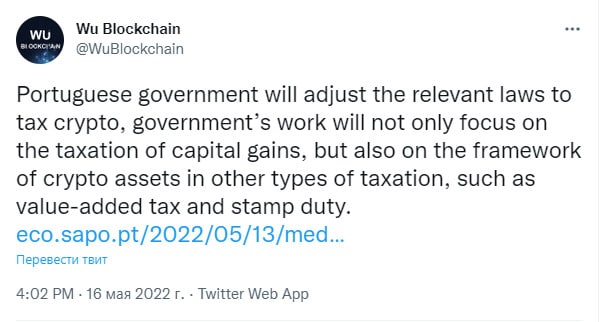 🗓Правительство Португалии скорректирует соответствующие законы о налогообложении криптовалюты. Работа правительства будет сосредоточена не только на налогообложении прироста капитала, но и на структуре криптоактивов при других видах налогообложения, таких как налог на добавленную стоимость и гербовый сбор