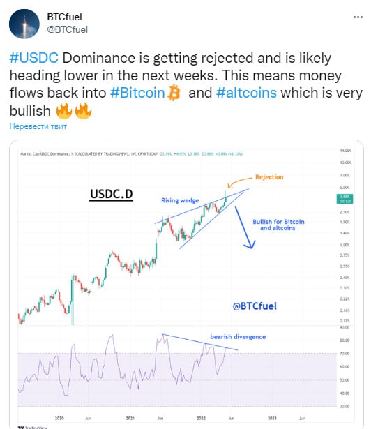 🗓"На дневном графике доминирования USDC может быть пробит вниз паттерн "Клин". Это значит, что денежные потоки могут вернуться в биткоин и альткоины. Бычий сигнал!"