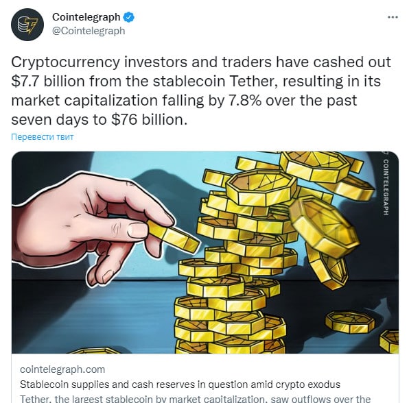 🗓Криптоинвесторы и трейдеры обналичили 7,7 млрд долларов из стейблкоина Tether, в результате чего его рыночная капитализация упала на 7,8% за последние семь дней до 76 млрд долларов.