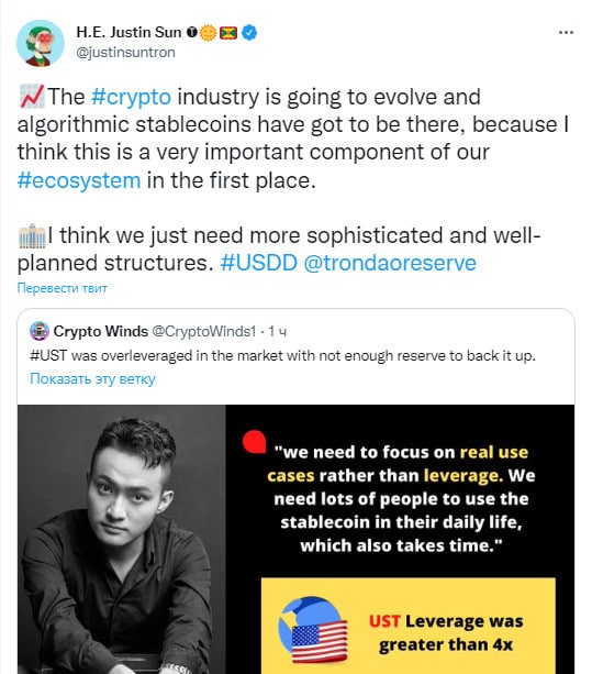 Хештег "USDD" намекает, что USDD, по его мнению, может быть таким стейблкоином