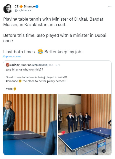 🗓CZ продул партию в настольный теннис Министру цифрового развития Казахстана, потому что "был в костюме" 😁