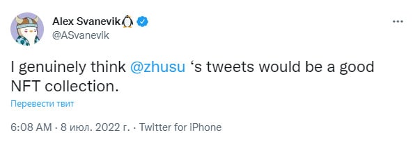 😆СЕО Nansen считает, что твит Су Чжу (главы обанкротившегося фонда 3AC) были бы хорошей коллекцией NFT