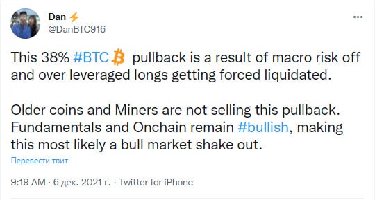 Старые монеты холдятся, майнеры не продают этот откат. Фундаментальные и он-чейн показатели остаются бычьими, что доказывает, что скорее всего, это был шейкаут в рамках бычьего рынка"