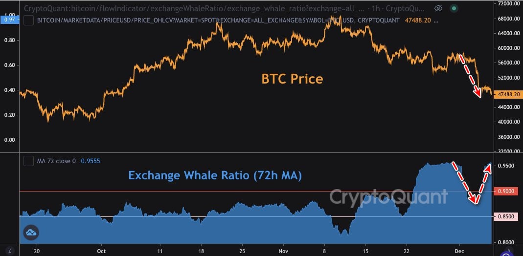 Об этом говорит китовый коэффициент EWR, который отслеживает соотношение 10 крупнейших депозитов ко всем остальным депозитам на бирже