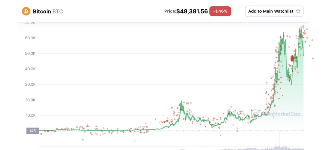 📈Если постоянные негативные сообщения о биткоине от экономиста Питера Шиффа вводят вас в сомнения, то вам может помочь график BTC, на который нанесены все его твиты