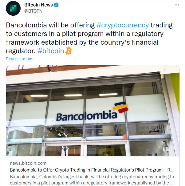 🗓Колумбийский банк Bancolombia будет предлагать клиентам торговлю криптовалютами в рамках пилотной программы. Финансовый регулятор страны уже установил нормативную базу