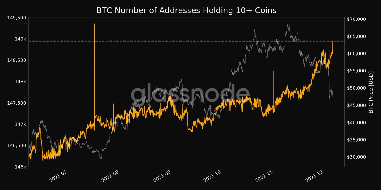📈Количество биткоин-адресов, владеющих 10 и более BTC, достиг 4-месячного максимума — 148 949, обновив рекорд 4 декабря 2021 (148 757 адресов)