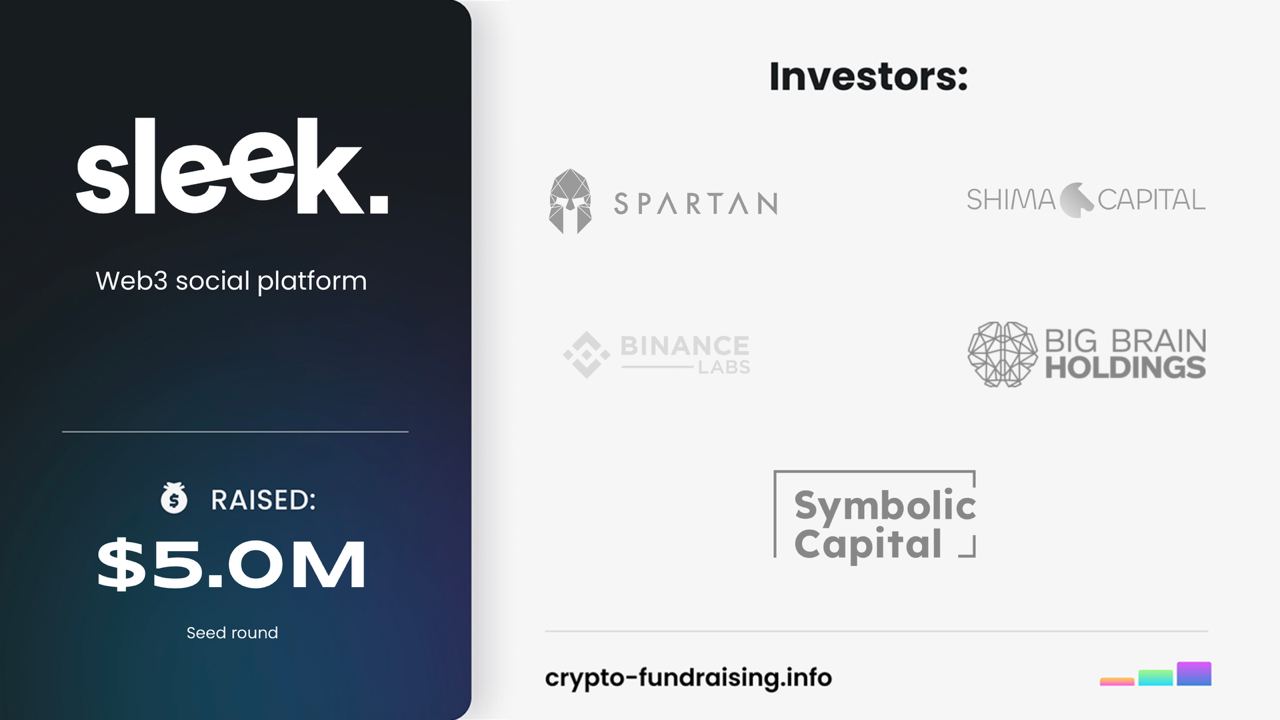 Web3 social platform Sleek raised $5M in a Seed funding round from Binance Labs Fund, Shima Capital, The Spartan Group, Symbolic Capital (ex Hyperedge Capital), Big Brain Holdings.