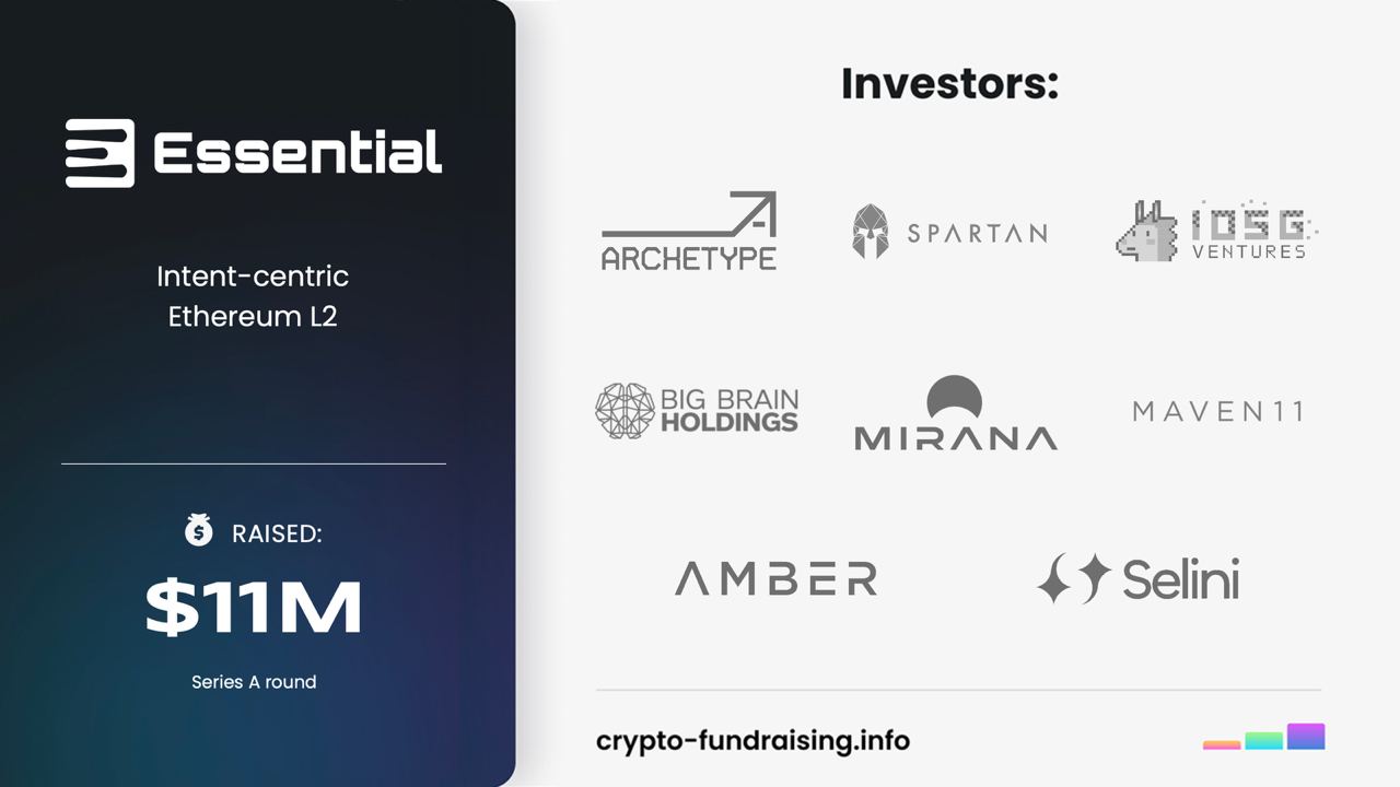 Intent-centric Ethereum L2 Essential raised $11M in a Series A funding round led by Archetype, with participation from IOSG Ventures, The Spartan Group, Mirana Ventures, Amber Group, Maven 11 Capital, Bodhi Ventures, Big Brain Holdings, Heartcore Capital, Selini Capital.