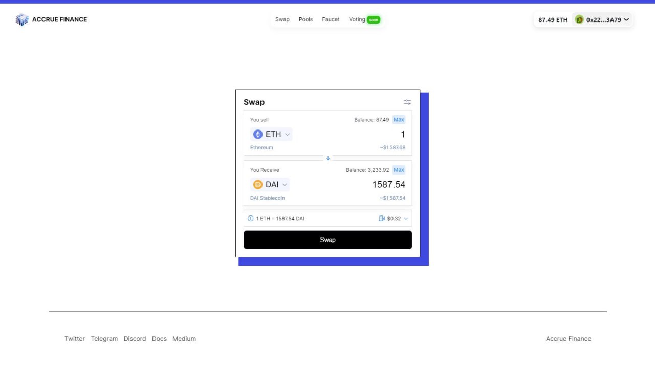 Accrue Finance — это классический DEX на блокчейне #Arbitrum. В функционал платформы входит: свапы, стейкинг и пулы ликвидности. Создателями являются Vice Protocol.