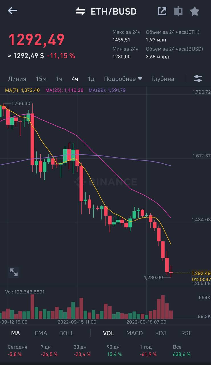 На днях мы пробили поддержку на 1500$, а это значит следующее: если покупатели не активируются, то мы стремительно продолжим нисходящий тренд. Пока активных движений нет(upd: уже зашевелилось), но если закрепляемся ниже, то я жду дамп.