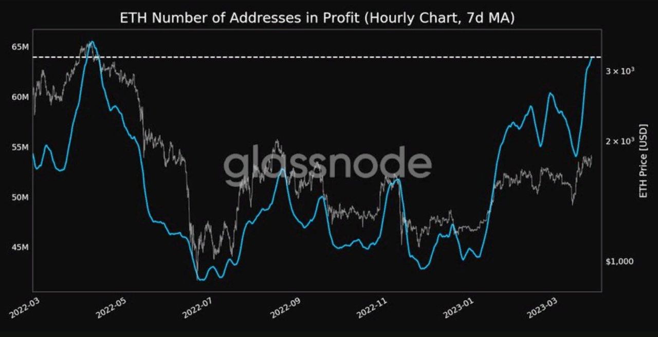 Количество прибыльных адресов на блокчейне росло на протяжении последних нескольких месяцев. Оно превысило 63,9 млн, об этом свидетельствуют данные команды Glassnode. Сейчас число прибыльных ETH-кошельков находится на самом высоком уровне с начала мая 2022 года.