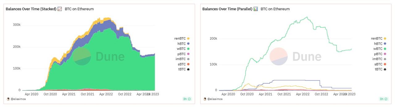 По данным платформы Dune Analytics, в мае 2022 года в WBTC были заблокированы 282 000 биткоинов. За последние 14 месяцев объем криптовалюты в экосистеме сократился на 44% до 158 000 BTC.