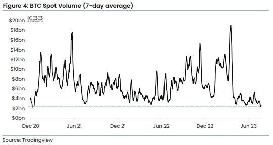 Объем биткоин-торгов на спотовом рынке упал до 30-месячного минимума
