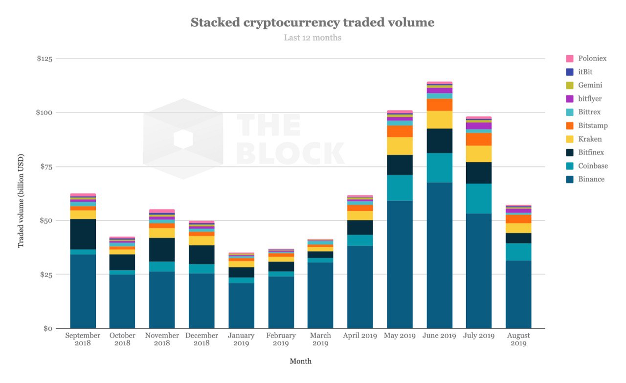 В августе объём торгов «полноправных» бирж криптовалют был равен $55 млрд, тогда как в июне значение составляло $111 млрд, свидетельствует статистика The Block.